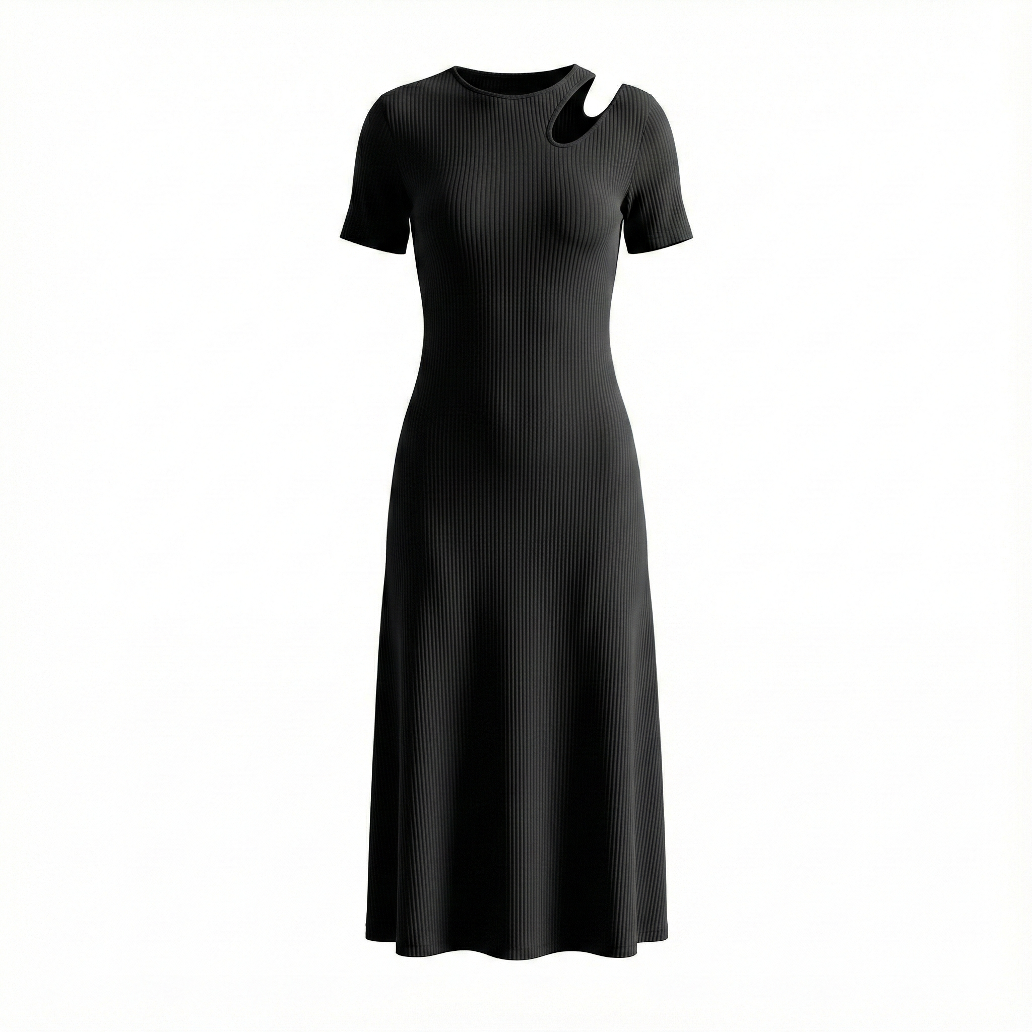 Lo que lo hace especial es el detalle cut-out (abertura) en el escote, un toque de tendencia que lo convierte en algo más que un simple vestido básico.